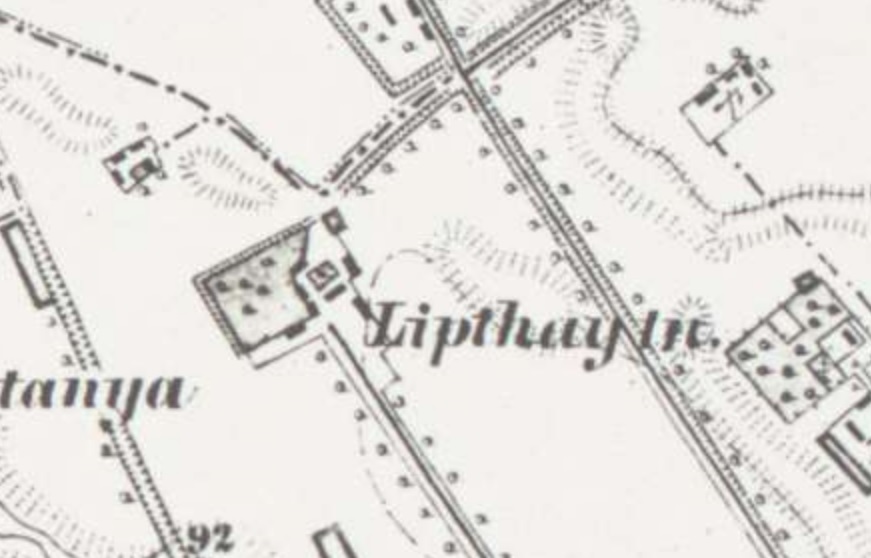 A Lipthay-tanya ábrázolása az 1881. évi kataszteri térképen - a tanya és annak épületei, a birtok pont a településhatárok találkozásánál található: